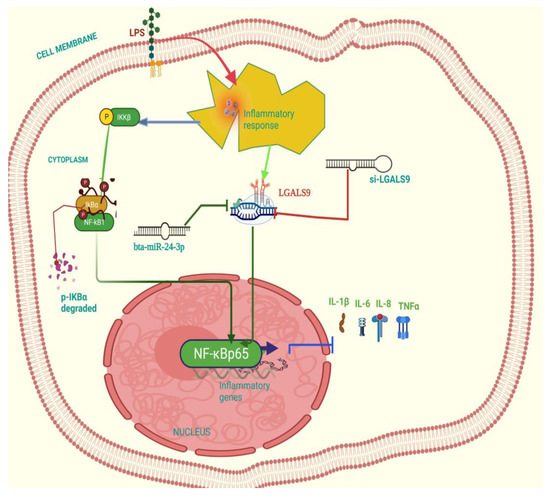 Figure 9. Schematic representation of the anti-inflammatory effect related signal transduction pathway in Bta-miR-24-3pon LPS-triggered bovine endometrial epithelial cells. This picture shows the induction of the cell with LPS to trigger an inflammatory response, which elevated the LGALS9 gene expression, and this gene expression was downregulated by Bta-miR-24-3p mimic. Likewise, knockdown of LGALS9 (si-LGALS9) leads to suppression of inflammatory response.