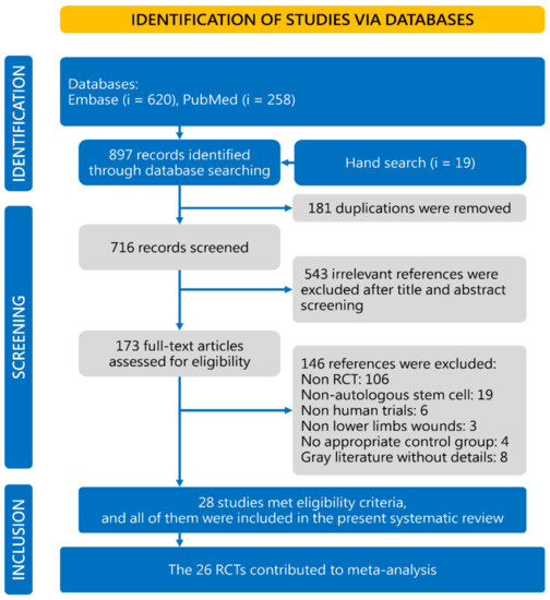 Concisely, a total of 716 studies were identified in the initial database search; 543 articles were excluded because they were not relevant to our study’s objective, according to our screening process outlined in Figure 1. Among the 173 potentially relevant studies, 28 RCTs matched the inclusion criteria for the current meta-analysis [15,25,26,27,28,29,30,31,32,33,34,35,36,37,38,39,40,41,42,43,44,45,46,47,48,49,50,51]. There were 146 studies further excluded: 106 studies were not RCTs, 19 studies did not use ASCT, 6 studies were non-human trials, 3 studies did not include lower extremity wounds, 4 studies used control groups that did not receive standard treatment with or without sham injections, and 8 studies were not retrievable full-length articles. In addition to the references in the flowchart, another 63 registry records in Cochrane Controlled Trials Register (based on primary search strategy in title abstract keyword) were also screened, while there was no additional RCTs on this topic.