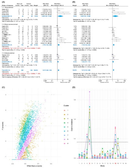 The meta-analysis was performed with RevMan 5.4 software, as recommended by Cochrane Handbook for Systematic Review of Interventions [21]. A risk ratio (RR) with 95% confidence interval (CI) was used to measure the dichotomous data. The continuous data were pooled by weighted mean difference (MD) for measurement based on similar units; whereas, when measurements were different, a standardized mean difference (SMD) with 95% CI was used. The Forest plots were visually inspected for result inconsistencies. Heterogeneity among studies was measured using I-square statistics (values ≥50% indicating substantial statistical heterogeneity among the trials) and chi-square tests (with p < 0.05 representing heterogeneity). Due to clinical heterogeneity, a random effects model was used to estimate pooled effect. The subgroup analysis was carried out for measuring time points, etiology, routes of administration, and source of stem cells. Moreover, we further performed a subgroup analysis for CD34, since it is a cell marker expressed by an extensive range of cells such as hematopoietic stem cells, endothelial progenitor cells, epithelial progenitor cells, and mesenchymal stromal cells [22,23]. A sensitivity analysis was carried out for the primary outcome by removing potential outliers indicated by Cook’s distance based on a Gaussian mixture model. Publication bias was assessed using funnel plots and Egger’s regression test for primary outcome [24] The trim-and-fill method was further applied for exploring whether pooled results could be seriously affected by publication bias. These further analyses were carried out using R version 4.1.0 via RStudio version 1.4.