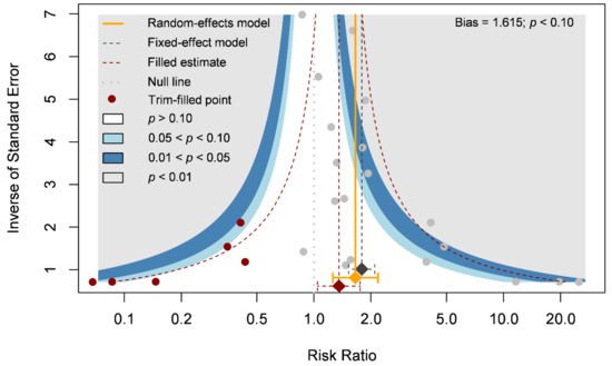 - Egger, M.; Smith, G.D.; Schneider, M.; Minder, C. Bias in meta-analysis detected by a simple, graphical test. BMJ 1997, 315, 629–634. [Google Scholar] [CrossRef] [PubMed]