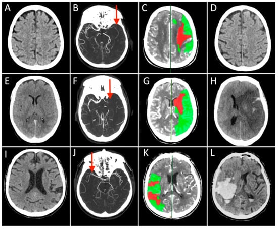 Each row represents a single patient’s images derived in different modalities and timepoints (Case 1 presented in (A–D), Case 2 in (E–H), and Case 3 in (I–L)). The first three columns on the left show the Non-Contrast-CT (NCCT), multiphase CT Angiography (CTA), and CT Perfusion (CTP) performed at hospital arrival, while the last column on the right displays the NCCT acquired at 24 h after stroke. On presenting NCCT (A,E,I) no early ischemic changes can be seen in the brain tissue in Case 2 and 3 (ASPECT score = 10), while a tissue swelling was detected in the right insular lobe in Case 1 (ASPECT score = 9, not shown). The mCTA images identified proximal (M1 segment) Middle Cerebral Artery (MCA) occlusion in the left hemisphere in (B,F), and contralateral side in (J) (red arrows). CTP showed in all cases a small infarct core corresponding to CBV lesion (red) and a large ischemic penumbra consisting of the difference between MTT and CBV lesions (green), representing the expected “salvageable” tissue after recanalization. In these patients, CBV lesion volume ≤ 50% of MTT lesion size. All patients were treated with combined IVT and MT, obtaining a complete recanalization, but the 24 h NCCT showed three different conditions: no ischemic lesion visible (D), complete MCA territory infarct associated with a massive cerebral oedema (H), and a vast hemorrhagic transformation of the ischemic lesion.