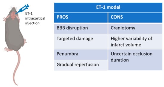 Schematic representation of Endothelin-1 stroke model, created with Biorender.com (accessed on 1 September 2021). On the right pros and cons table of the model.