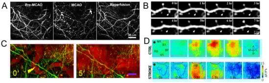 Assessing the extension and progression of the CE and HT may not be sufficient to understand the reasons for the discrepancies in the clinical cases reported above. As described before, the entire NVU is involved in the degradation process triggered by cerebral ischemia. In turn, this cascade of events affects brain organization at all levels, from single synapses to neuronal networks to whole-brain activity. More in-depth understanding of the ischemic progression that leads to neuronal survival or massive degeneration in the penumbral tissue with cellular and subcellular detail is necessary. Preclinical research, though it is still not always able to reproduce the complexity and the variety of human clinical cases, presents the great advantage of dissecting neuronal structure and function over multi-scale. In the last decades, the development of 2PFM [], coupled with the introduction of transgenic mice expressing genetically encoded fluorescent indicators in cortical neurons [], has enabled investigators to visualize longitudinal changes in the structure of dendritic spines in vivo. In particular, many studies have focused on structural and functional plasticity as targets of both acute and chronic ischemia [,,,]. These studies indicated the loss of spines and rapid swelling and beading of dendritic structure within minutes of global ischemia coincident with a wave of ischemic depolarization []. Many studies [,,] focused their attention on spines’ turnover and dendritic orientation in the peri-infarct cortex. In particular, dendritic structures can be profoundly altered by MCAO [], whereas reperfusion can lead to recovery of structure similar to pre-stroke levels. In another work, Murphy and collaborators [] demonstrated that the capability of dendritic arbors to recover within the penumbra was still maintained after 60 min of sustained ischemia (Figure 6A). By exploiting in vivo 2PFM and laser speckle contrast imaging, they correlated dendritic blebbing with the fluctuation of blood flow, showing that the recovery of the dendritic structure following reperfusion is restricted to a relatively small penumbra region. Brown and colleagues [] took advantage of 2PFM to monitor real-time changes in dendritic and vascular structure in a mouse model of photothrombotic stroke (Figure 6B). In parallel, other studies investigated blood flow before and after multiphoton nano surgery of single blood vessels in living animals [] (Figure 6C). 2P real-time imaging of blood flow through the blood vessels in the region of the cortex surrounding the vascular lesion permits the characterization of the dynamics of the degenerative event []. Since the reorganization of surviving cortical areas is involved in post-stroke recovery, in the last decades, neuroscience pointed their attention to functional in vivo studies too. Harrison and colleagues [] investigated functional rearrangement between cortical regions in a mouse model of photothrombotic infarct targeted in the motor cortex. In this longitudinal study, they observed, through a combination of sensory-motor stimulations and intrinsic optical signal imaging, which spared regions of the cortex surrounding the stroke core were able to assume functions from stroke affected areas. Thereafter, Lim and collaborators, by taking advantage of voltage sensitive dye and optogenetic cortical stimulation, investigated neural rearrangement of cortical networks in the mouse brain cortex []. This relatively noninvasive approach allows recording neuronal activity triggered by optogenetic stimulation with high temporal resolution and large spatial resolution. This work provided evidence of the global depression of cortical activity characterizing the early stages after stroke. Moreover, they observed at a later time point (8 weeks after stroke) that the global depression gradually resolved, though the overall strength of the network remained reduced. Recently, Allegra Mascaro et al. [] performed a multi-scale study investigating structural and functional plasticity in parallel, in a mouse model of post-stroke rehabilitation. More in detail, they observed in the peri-infarct cortex an increase in spines’ surviving fraction and a preferential orientation of dendrites towards the stroke core. Moreover, by investigating cortical activity during the execution of a motor task, they observed a widespread activation in chronic conditions (Figure 6D).