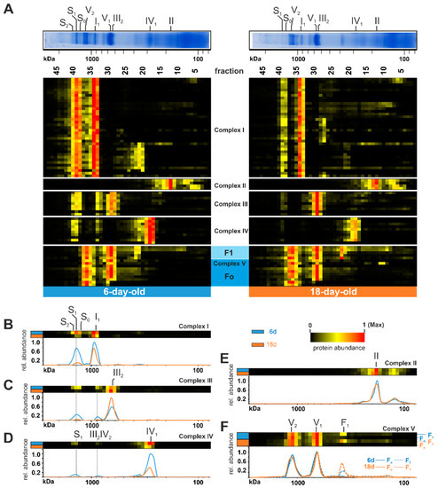 To reveal age-dependent changes in the OXPHOS, we generated a heat map and compared the distribution profiles of both age stages (Figure 2). An age-related reduction of mtRSCs is clearly seen in the decreased abundance of proteins belonging to complex I, complex III, and complex IV in fractions 38 to 40 (mass range 1200 kDa up to 1600 kDa) (Figure 2A). This is in good agreement with previously published data obtained in an analysis about the role of F1Fo-ATP-synthase dimers in the aging of P. anserina [21]. Such an age-dependent reduction of mtRSCs was also observed in different rat tissues [71,72]. In cardiac mitochondria from aged rats, it was demonstrated that the mtRSCs with the highest molecular masses were diminished [72]. Additionally, in mitochondria from the brain cortex of aged rats, a loss of mtRSCs stability was described [71]. Furthermore, mtRSCs play a role in various human diseases, such as Barth syndrome, heart failure, and Parkinson’s disease [76,77,78,79]. In addition to changes in mtRSC abundance, we observed changes in the individual complexes of the OXPHOS. Particularly, the abundance of complex I subunits was reduced from 6-day-old to 18-day-old samples in fractions 33 and 34 (position of individual complex I at ~900 kDa) (Figure 2A,B). A more detailed evaluation of these changes follows in a subsequent section. The total abundance of complex III did not change (Table S1C). Instead, during aging, complex III containing mtRSCs disintegrated into individual complex III dimers (Figure 2A,C). Similarly to complex I, the amount of complex IV was reduced in older cultures (Figure 2D). The age-dependent dissociation of the complex IV-containing mtRSCs should instead increase the amount of complex IV monomer. However, the amount of monomeric complex IV was much lower, suggesting additional reasons for the loss of this complex and supercomplexes (Figure 2D). Minor alterations were observed in complex II (Figure 2A,E). Here, the total amount of individual subunits was not affected. In contrast to the other complexes, complex V exists in a monomeric (V1), as well as in a dimeric (V2), state [70]. An age-related dissociation of complex V dimers, as described in earlier studies [20,21], was not observed in the current analysis (Figure 2A,F). However, due to the use of different cultivation media, the cultures in the previous study were physiologically older than in the current study, suggesting that the dissociation of complex V dimers may occur at the end of life. Interestingly, some subunits of complex V were found in lower fractions with an increased abundance in the older sample (lower panel of Figure 2A). These subunits are part of the F1 domain of complex V, indicating an imbalanced assembly of F1 and Fo domains (Figure 2F).