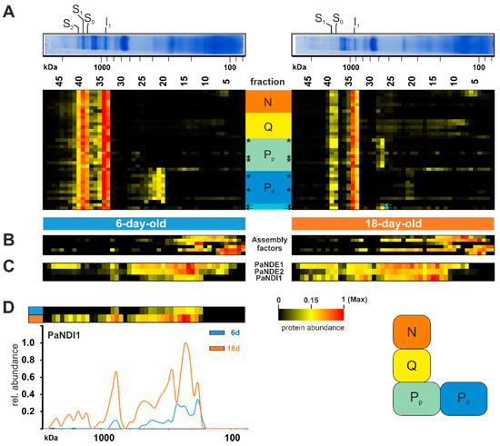 Increase of alternative NADH dehydrogenase PaNDI1 during aging. (A) Quantified proteins of complex I, assignment to modules, complex I assembly factors, (B) homologs of complex I assembly factors and (C) the alternative NADH dehydrogenases PaNDI1 (Pa_7_1820), PaNDE1 (Pa_1_24200) and PaNDE2 (Pa_7_5390) are represented in heat maps. Mitochondrial-encoded proteins are marked by asterisks (*). Complex I modules were assigned according to [80] N-module (N) in orange, Q-module (Q) in yellow, proximal proton pumping module (Pp) in light green, distal proton pumping module (Pd) in blue. Two unassigned subunits marked in light cyan. The color scale of heatmaps ranges from black (not identified), to yellow (15% of the maximum), to red (maximum abundance). (D) Distribution profiles of PaNDI1 in 6-day-old (grey line) and 18-day-old (orange line) wild-type mitochondria. For detailed information about the corresponding proteins refer to Table S1D.