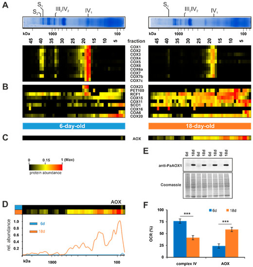 In the next set of analyses, we investigated the reduction of complex IV in more detail. Complexome profiling identified ten subunits of complex IV, whose abundance was reduced during aging (Figure 4A). Among these are the three mitochondrial-encoded catalytic subunits, PaCOX1, PaCOX2, and PaCOX3. PaCOX1 was one of the most reduced subunits in the 18-day-old sample compared to the 6-day-old sample (upper lane in Figure 4A). Since COX1 initiates the complex IV assembly [97,98], it is possible that this strong reduction affects the other subunits and leads to their reduction in quantity. Furthermore, the huge reduction of this mitochondrial-encoded subunit was expected, due to the age-related reorganization of the mtDNA and the reduction of the number of mtDNA copies [29,30,31,32,33]. Another explanation for the reduced PaCOX1 amount could be the fact that an intron of the PaCox1 gene codes for the plDNA, which becomes liberated during aging, leading to the mtDNA reorganization [30,31,32]. To reduce excessive plDNA formation, transcription of the PaCoxI gene might be downregulated. Indeed, a reduced Pa Cox1 transcript level was found in a previous transcriptome analysis [55]. Other associated factors such as RCF1 and complex IV assembly factors were elevated in old mitochondria, indicating stalled assembly (Figure 4B).