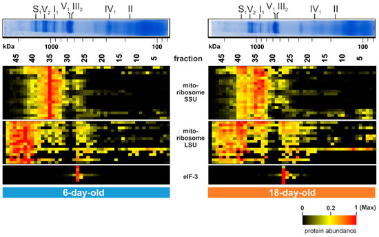 Beside the described age-dependent alterations further noticeable changes were detected in gel fraction 35 (1 MDa) and in fractions between 40 (1.5 MDa) and 46 at 2.4 MDa (Figure 5). The 20 corresponding proteins in fraction 35 are part of the small subunit (SSU) of the mitochondrial ribosome and the 16 clustered proteins between fractions 40 and 46 are part of the large subunit (LSU) of the mitochondrial ribosome. The SSU as well as the LSU amount decline during aging and were partly found to be disintegrated in the 18-day-old sample (Figure 5). This suggests a breakdown of the mitochondrial ribosome during aging of the P. anserina wild type. An age-associated change of the translation machinery was also found in various other organisms [114]. This decline of fully assembled mitochondrial ribosomes, together with the well-described decrease in mtDNA copy number [29,30,31,32,33], ultimately explains the dramatic decrease in the level of mitochondrial encoded proteins.