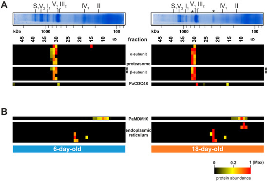 Age-dependent increase of non-mitochondrial complexes. (A) Quantified proteins of the proteasome and PaCDC48 (Pa_7_5590) are represented in a heat map. (B) Selected quantified proteins of the endoplasmic reticulum and PaMDM10 (Pa_7_11600) are represented in a heat map. The color scale ranges from black (not identified), to yellow (20% of the maximum), to red (maximum abundance). Asterisks (*) mark hitherto uncharacterized protein bands. Hashtags (#) mark two catalytic subunits (PaPRE3 and PaPRE2) of the proteasome β-subunits. For detailed information about the corresponding proteins refer to Table S1F.