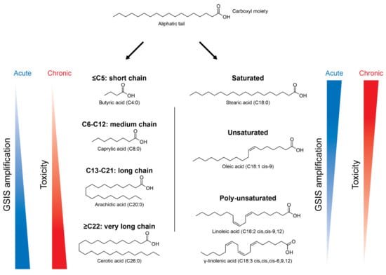 Nomenclature of different types of fatty acids (FAs) and their effects in pancreatic β-cells according to chain length and degree of saturation. FAs are composed by a carboxyl moiety bonded to an aliphatic tail, with variable number of carbons. Depending on the number of carbons, FAs can be divided in short-chain (C ≤ 5), medium-chain (C6-C12), long-chain (C13-C21) and very long-chain (C ≥ 22). They can also be: (i) saturated, with no double bonds, as stearic acid (C18:0); (ii) unsaturated, with one double bond, as oleic acid (C18:1); and (iii) poly-unsaturated, with more than two double bonds, as linoleic acid (C18:2) and γ-linolenic acid (C18:3). FAs are known to increase the glucose-stimulated insulin secretion (GSIS), but can also be toxic in the long-term. The potency of GSIS amplification is positively influenced by the carbon chain length and negatively influenced by the degree of unsaturation.