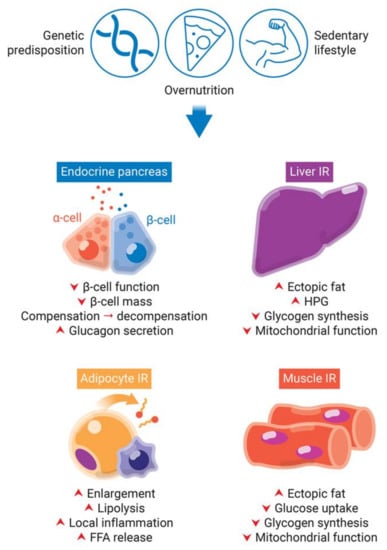 Despite T2D having an important genetic component [3,4,5], the recent rise in T2D cases can be mostly attributed to the increase in obesity and lack of physical activity; both being insulin resistance-promoting states [1,2]. Moreover, central (or visceral) adiposity is better linked to insulin resistance and plasma levels of glucose, insulin, cholesterol, triglycerides and high-density lipoprotein cholesterol than total adiposity. In persons with prediabetes (impaired fasting glucose, impaired glucose tolerance, without overt hyperglycemia), insulin resistance is compensated by insulin secretion to maintain normoglycemia. It is only when pancreatic β-cell’s capacity is overwhelmed and insulin secretion fails—via either loss of β-cell function or mass (discussed later)—that overt hyperglycemia and T2D ensue [6,7]. The consequent glucose intolerance can further impair insulin sensitivity and promote micro- and macrovascular complications, typical of T2D.