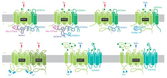 NOX are enzymatic complexes, formed by multiple protein subunits, and are responsible for production of O2•− or H2O2, through reduction of O2, using NADPH as the electron donor [110]. The complex is formed by a catalytic core located in the membrane and also called NOX, and structural and regulatory proteins located in the cytosol and in the membrane (Figure 3). The mammalian genome encodes seven homologous genes: NOX1, NOX2, NOX3, NOX4, NOX5, DUOX1, and DUOX2 [114,115] (Figure 3).