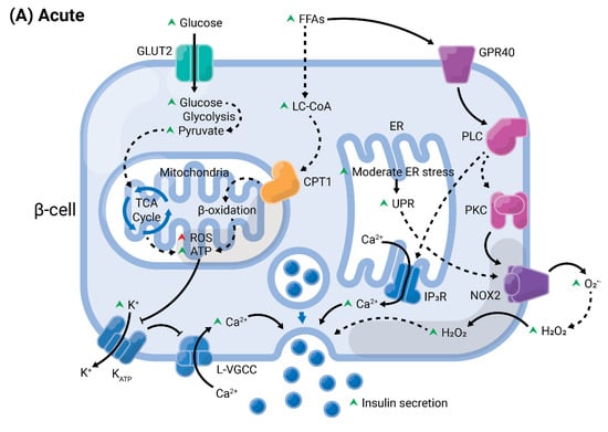 Summary of acute versus chronic effects of fatty acids (FAs) in pancreatic β-cells. Glucose enters the β-cell through specific transporters located at the plasma membrane, GLUT2 (in rodents). After its phosphorylation by glucokinase, it undergoes various modifications by enzymes from the glycolysis, until the generation of pyruvate. This enters the mitochondria and is oxidized in the tricarboxylic acid (TCA) cycle. The electrons are transferred to the electron transport chain, resulting in the generation of reactive oxygen species (ROS), as byproducts, and ATP. (A) In acute conditions, FAs enter the cells and are converted into long-chain fatty-acyl CoA (LC-CoA), which is translocated to the mitochondria via carnitine palmitoyltransferase 1 (CPT1) to be oxidized in the β-oxidation, generating ATP and ROS. The increase of ATP/ADP leads to the closure of K+ channels sensitive to ATP (KATP) at the plasma membrane. The consequent membrane depolarization leads to the opening of L-type voltage-gated Ca2+ channels (L-VGCC). The rapid Ca2+ influx mobilizes insulin granules, which are released. Long-chain saturated or unsaturated FAs can also bind to Gαq-protein coupled receptor GPR40 at the plasma membrane. This activates the phospholipase C (PLC)/diacylglycerol (DAG) pathway, which respectively activates PKC and mobilizes Ca2+ from the endoplasmic reticulum (ER), potentiating GSIS. Activation of PKC may also activate NADPH oxidase 2 (NOX2) at the plasma to produce ROS, which are second messengers for GSIS. (B) Chronic exposure to FAs leads to depletion of ER Ca2+ and activation of ER stress, and potentiates ROS formation in all compartments (cytosol, mitochondria, and ER). Prolonged and unresolved oxidative stress, ER stress, and mitochondrial dysfunction culminate in apoptosis and dysfunction.