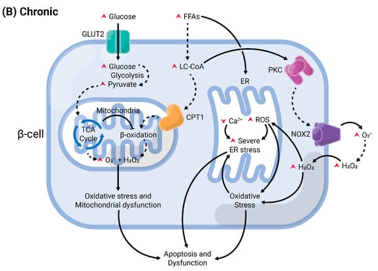 During T2D development, the chronic exposure to glucose and saturated FAs, and the high demand for insulin, leads to an increase of misfolded and unfolded proteins in the ER lumen, due to the high demand for protein synthesis and due to Ca2+ disbalance in the ER, inducing ER stress. In addition, there is an increase of ROS production in β-cells and a consequent oxidative stress [9]. Both stresses are interconnected and can initiate the production of chemokines and inflammatory cytokines, which attract and activate immune cells in the islet microenvironment [9]. The exacerbation of this condition leads to disturbance of secretory function, culminating in β-cell apoptosis [9,76].