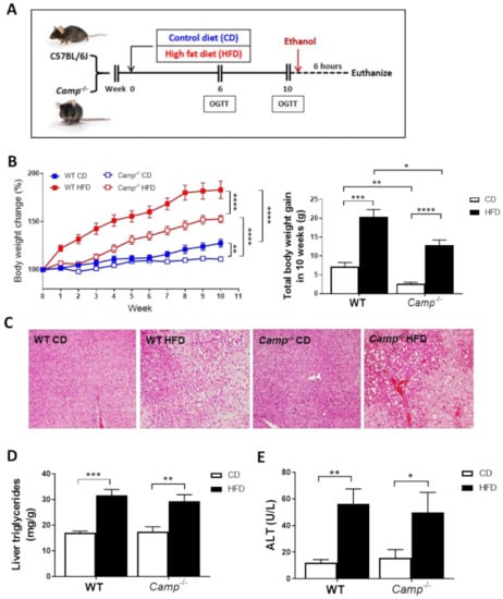 CRAMP KO (Camp−/−) male mice (Jackson Laboratory, Bar Harbor, ME) at the age of 8–10 weeks were used with their age-matched WT mice. Mice were maintained at 22 °C with a 12 h light/dark cycle and had free access to a normal chow diet and tap water. WT and Camp–/– mice were subjected to an adjusted calories control diet (CD) (10% total kcal from fat) or an adjusted calories high-fat diet (HFD) (42% total kcal from fat) for 10 weeks, followed by one binge alcohol gavage (CDE/HFDE), 6 h before tissue harvesting. The feeding paradigm is depicted in Figure 1A. During the 10-week feeding period, mouse body weights in each feeding group were recorded weekly. At the end of the 6th and 10th week, an oral glucose tolerance test (OGTT) was conducted in each CD or HFD feeding group. At harvest, a portion of the liver and eWAT tissue were collected and fixed in formalin solution for histological analysis, and the rest of the tissues were stored for mRNA and protein extraction. The serum samples were collected for biochemical study.
