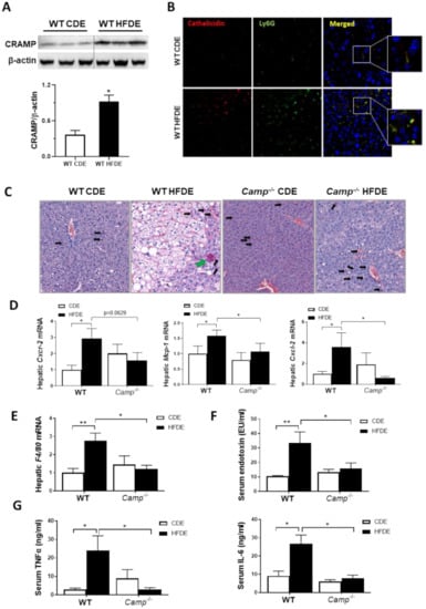 Camp–/– mice had attenuated inflammatory response induced by HFDE treatment in the liver. (A) Representative immunoblots (upper panel) and quantification (lower panel) of CRAMP protein in whole liver lysates of WT mice. (B) Immunofluorescence (IF) co-staining of Ly6G (Green) and cathelicidin (antibody for mouse CRAMP) (Red) antibodies. Blue: DAPI for nucleus staining. Magnification: 200×. (C) CAE staining of paraffin embedded liver tissue. Infiltrated scattered neutrophils: black arrows; clustered neutrophils: green arrow. Magnification: 100X. (D) Hepatic mRNA level of Cxcr2, Mcp1 and Cxcl2. (E) Hepatic F4/80 mRNA level. (F) Serum endotoxin concentration. (G) Serum levels of TNFα and IL6. Data are expressed in Mean ± SEM (n = 5 mice/group). * p ≤ 0.05, ** p ≤ 0.01.