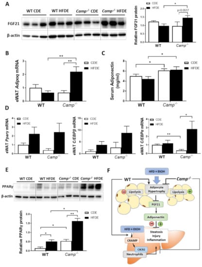 HFD feeding plus alcohol promoted FGF21/adiponectin upregulation in Camp–/– mice. (A) Representative images of eWAT FGF21 immunoblotting (left panel) and its quantification (right panel). (B) eWAT Adipoq mRNA levels. (C) Serum adiponectin protein levels, n = 6–9. (D) Relative mRNA level of Pparg, Cebpb and Cebpa in eWAT. (E) Representative Western blots for PPARγ protein level (upper panel) and quantification (lower panel) in eWAT. (F) Schematic hypothesis of the protective effects of CRAMP deficiency in HFDE-induced liver steatosis, injury and inflammation. Data are expressed in Mean ± SEM (n = 5 mice/group). * p ≤ 0.05, ** p ≤ 0.01.