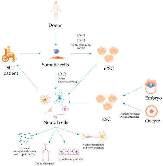 Treatments of SCI with pluripotent and reprogrammed cells. Patient- or donor-derived somatic cells can be reprogrammed into iPSC, which can then be differentiated into neural cells for transplantation to restore function in patients with SCI. PSC derived from embryos or oocytes are an alternative source of neural cells for therapy. Direct reprogramming of somatic cells to neural cells (without passing through a pluripotent state) has also been achieved and could be used for SCI treatment. Several mechanisms for neural cell-mediated repair have been suggested, such as cell replacement, the release of immunomodulatory and trophic factors, regeneration and remyelination of axons, and/or reduction of glial scarring. Created with BioRender.com (last accessed on 15 November 2021).