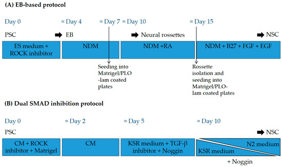 General scheme of differentiation protocols used to produce NSC from PSC. (A) Example of an EB-based protocol. Undifferentiated PSC are grown in suspension in embryonic stem (ES) medium with ROCK inhibitor to form embryoid bodies (EB) that are further cultured in neural differentiation medium (NDM) containing N2 supplement, seeded on coated plates, and directed to form neural rosettes containing neuroepithelial cells. (B) Example of a dual SMAD inhibition-based protocol. Undifferentiated PSC are plated on Matrigel as single cells in an MEF (mouse embryonic fibroblasts)-conditioned medium (CM) and different inhibitors are added to the cells in the presence of knockout serum (KSR) medium. KSR medium is then gradually replaced by medium with N2 supplement. ROCK: Rho kinase; PLO-lam: poly-L-ornithine-laminin; RA: retinoic acid; FGF: fibroblast growth factor; EGF: epidermal growth factor; TGF-β: transforming growth factor beta.