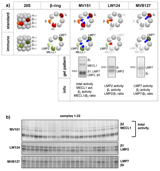 Figure 1. Proteasome activity profiling in peripheral blood mononuclear cells using activity-based probes (ABPs). (a) The 20S core particle of the proteasome is composed of four rings consisting of seven subunits each with dyad symmetry. The outer two α-rings control the opening of the gate and attachment to regulatory particles, while the inner two β-rings each comprise three different proteolytically active β-subunits: β1, β2, and β5 for the standard proteasome (present in every cell type). The immunosubunits LMP2, MECL1, and LMP7 are mainly found in lymphoid cells. With a set of three different ABPs, which bind to and fluorescently label the active centers, the six different β-subunits can be distinguished, see lower panel of the figure. MV151 labels all six proteasome subunits, and can be used for total proteasome activity assessment, but additionally MECL1 and β2 can be analyzed individually. LW124 labels LMP2 and β1, while MVB127 labels LMP7 and β5. The latter two have different fluorescent labels (here denoted in red and blue) and can be used simultaneously. For all three ABPs, the ratio of immunoproteasome subunit and their standard proteasome counterpart can also be determined. (b) Representative gel loaded with samples from 22 study participants and analyzed using the three activity-based probes MV151 to detect β2, MECL1 and total activities, LW124 to discriminate β1 and LMP2, and MVB127 to quantify β5 and LMP7 activities.