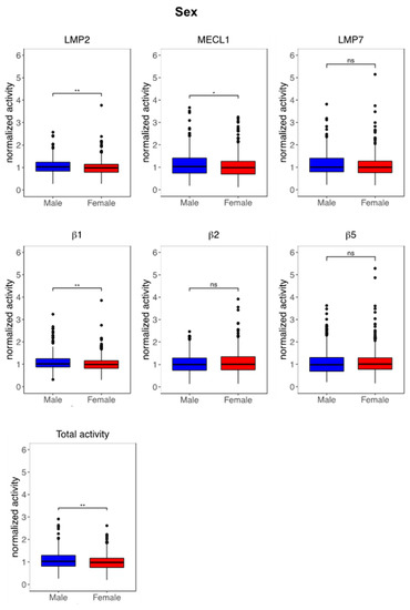 Figure 3. Immunoproteasome activity in PBMCs depends on sex and is lower in women. Activity-based probe (ABP) analysis of proteasome activity in peripheral blood mononuclear cells (PBMC) of male and female adults in the KORA-FF4 cohort. All samples were normalized to the batch-specific median. Normalized activities are shown as boxplots of proteasome parameters according to sex with median, 1st and 3rd quartile and whiskers indicating ± 1.5 *IQR (interquartile range). Differences between the two groups were tested using Wilcoxon rank sum test, * = p < 0.05 and ** = p < 0.01, ns = non-significant.