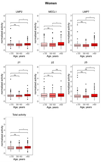 Figure 4. Immunoproteasome activity is distinctly activated in aged women. Activity-based probe (ABP) analysis of proteasome activity in peripheral blood mononuclear cells (PBMC) of female adults in the KORA-FF4 cohort. All samples were normalized to the batch-specific median. Age was categorized into ≤55, 56–60 and >60 years of age. Normalized proteasome activities are shown as boxplots of proteasome parameters according to age with median, 1st and 3rd quartile and whiskers indicating +/− 1.5 *IQR (interquartile range). Differences between groups were tested using pairwise Wilcoxon rank sum test. * = p < 0.05 and ns = non-significant.