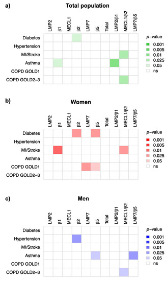 Figure 5. Differential regulation of proteasome activities in chronic inflammatory diseases. Multiple linear regression models for the association between diabetes, hypertension, myocardial infarction and/or stroke, asthma and COPD with log2 transformed proteasome parameters, additionally adjusted for sex, age, BMI, smoking status, and leukocyte cell count were calculated. The p-values resulting from the regression models based on the total study population (a) as well as separately for women (b) and men (c) are displayed. p-values above 0.05, indicating non-significant associations, are displayed in white color whereas significant associations are displayed in green, red or blue color, respectively. The color intensity increases with decreasing p-value.