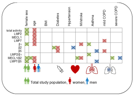 Figure 6. Summary of the main findings of this study with regard to the differential regulation of proteasomal activities in PBMCs depending on sex, age, BMI and chronic inflammatory diseases. Significantly regulated proteasome activities are shown in color (green: mixed population, red: female population, blue: male population) irrespective of the association strength. Non-significant associations are displayed in white color.
