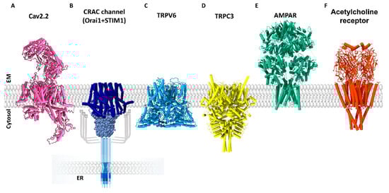Structures of Ca2+ ion channels. Side views of the structures of the following ion channels, which are representative of the ion channel family to which they belong: (A) Voltage-gated Ca2+ ion channel: Cav2.2 (PDB:7MIY); (B) CRAC channel: Orai1 embedded in the plasma membrane and activated by direct coupling of STIM1 located in the endoplasmic reticulum; (C) Transient receptor potential vanilloid 6 (TRPV6) channel (PDB: 7K4A); (D) Transient receptor potential canonical 3 (TRPC3) channel (PDB: 5ZBG); (E) α-amino-3-hydroxy-5-methyl-4-isoxazolepropionic acid (AMPA) receptor (PDB: 5IDE); (F) Acetylcholine receptor (PDB: 2BG9).