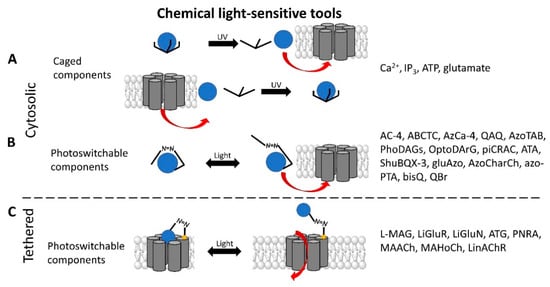 Schematic and examples for chemical light-sensitive tools: (A) Cytosolic caged components release a caged group or capture a Ca2+ ion upon irradiation with UV light. (B) Cytosolic and (C) tethered photoswitchable ligands which switch between two conformations upon irradiation with light of alternating wavelengths.