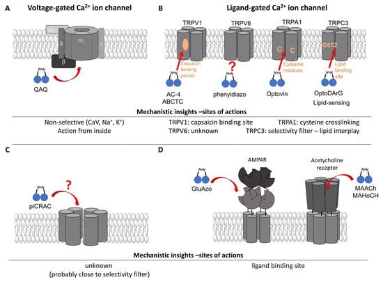 Scheme highlighting known or potential working mechanisms or sites of action of photoswitchable ligands: (A) The quaternary ammonium ion (QAQ) acts as an intracellular pore blocker of CaV channels. (B) Photoswitchable TRPV1 agonists/antagonists (AC-4, ABCTC) likely modulate ion channel function via binding the capsaicin-binding pocket. The photoswitchable rhodanine derivative, optovin, modulates TRPA1 function via covalent thioether formation with redox-sensitive key cysteines (Cys 621, 633 and 856) in the channel. OptoDArG, a highly efficient photochromic ligand for TRPC3, acts via a lipid sensing domain near the selectivity filter. Based on a TRPV6 inhibitor, a photoswitchable ligand appended with a phenyldiazo was shown to allow rapid photoswitching, however the site of action is still unknown. (C) piCRAC-1, based on the GSK-5498A compound, was shown to reversibly switch CRAC channels, however the site of action is unknown. (D) The soluble photoswitchable glutamate and acetylcholine receptor ligands acts via the corresponding ligand binding domain.