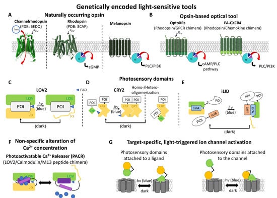 Spectrum of light-sensitive genetically encoded tools: (A) Naturally occurring opsins including channelrhodopsin (PDB: 6EDQ), rhodopsin (PDB: 3CAP), and melanopsin. (B) Based on opsins, e.g., OptoXRs and PA-CXCR4 were developed as optical tools to manipulate various cellular signaling cascades depending on cAMP/PLC or PLC/PI3K pathways. (C–E) Naturally occurring photosensory domains include the LOV2 domains (C), the CRY2 domains (D), and the iLID domain generated via the dimerizing peptides SsrA and SsrB (E). (F) Photoactivatable Ca2+ releaser (PACR) composed of a LOV2 domain, CaM, and a M13 peptide enables light-triggered release of Ca2+. (G) Possibilities for target-specific, light-triggered ion channel activation via photosensory domains, either only attached to an active site, or to both the ion channel and an active site. While the active site is hidden in the dark state, it is released upon blue light irradiation.