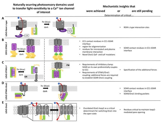 - Ma, G.; Wen, S.; Huang, Y.; Zhou, Y. The STIM-Orai Pathway: Light-Operated Ca(2+) Entry Through Engineered CRAC Channels. Adv. Exp. Med. Biol 2017, 993, 117–138. [Google Scholar] [CrossRef] [PubMed]