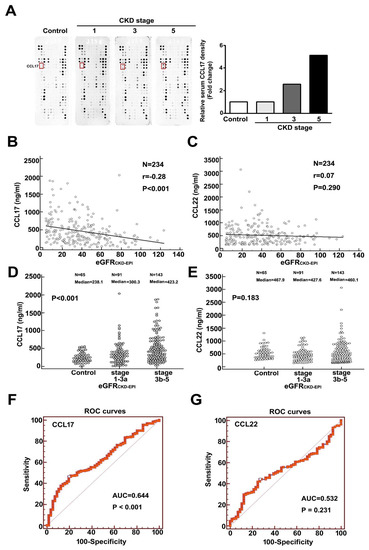 Figure 1. Increasing expression of CCL17 with decreasing renal function. (A) Human cytokine array profile of cell lysates from the normal population and patients with CKD stages 1, 3, and 5. CCL17 spots are marked. Correlation analysis of (B) CCL17 (C) or CCL22 with eGFRCKD-EPI for all CKD patients. Comparison of mean serum values of (D) CCL17 (E) and CCL22 between the normal population (control), CKD stages 1–3a and stages 3b–5. The area under the receiver operating characteristic curve indicated the diagnostic power of (F) CCL17 (G) and CCL22 for predicting advanced CKD (stages 3b–5).