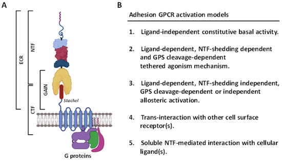 In recent years, the GPCR superfamily has been further classified based upon their phylogenetic characteristics and subdivided into five main families, including glutamate, rhodopsin, adhesion, frizzled/Taste2, and secretin (GRAFS) [9]. Among these, the adhesion GPCRs (aGPCRs) have several unusual structural and functional features [10] (Figure 1). Firstly, the extracellular region (ECR) of most aGPCRs is uncommonly large and often consists of diverse cell-adhesive protein modules such as the epidermal growth factor (EGF)-like, immunoglobulin (Ig)-like, and lectin-like domains at its N-terminal half. These protein modules normally function as the binding sites for specific cellular ligands and/or binding partners of aGPCRs [10,11]. Secondly, the majority of aGPCRs comprise a signature GPCR autoproteolysis-inducing (GAIN) domain at the C-terminal half of ECR. A self-catalytic proteolytic reaction normally occurs during receptor biosynthesis at the consensus GPCR proteolysis site (GPS) within the GAIN domain [12,13,14]. As a result, GPS cleavage disjoints the receptor into a non-covalent dual-subunit complex comprising an N-terminal extracellular fragment (NTF) and a C-terminal 7TM fragment (CTF) [12,13,14] (Figure 1A). Thirdly, the activation and signaling mechanisms of aGPCRs are multifaceted, including the GPS cleavage-dependent and -independent as well as NTF-CTF dissociation-dependent and -independent modes [10,15,16,17]. Nevertheless, a tethered agonism model is well accepted as the common activation mechanism for most aGPCRs [18,19]. This involves the unmasking and binding of a tethered agonistic Stachel peptide with its own 7TM, following the separation of NTF from CTF caused by the binding of its cellular ligand(s) to the ECR [20] (Figure 1B).