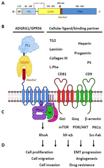 Due to the structural complexity and functional diversity, the study of aGPCRs is still in its infancy. The human aGPCR family consists of 33 distinct members, some of which have been increasingly linked to various aspects of cancer biology [21,22,23]. In this review article, we summarize the molecular and functional properties of ADGRG1/GPR56 and discuss its diverse roles in tumor progression.