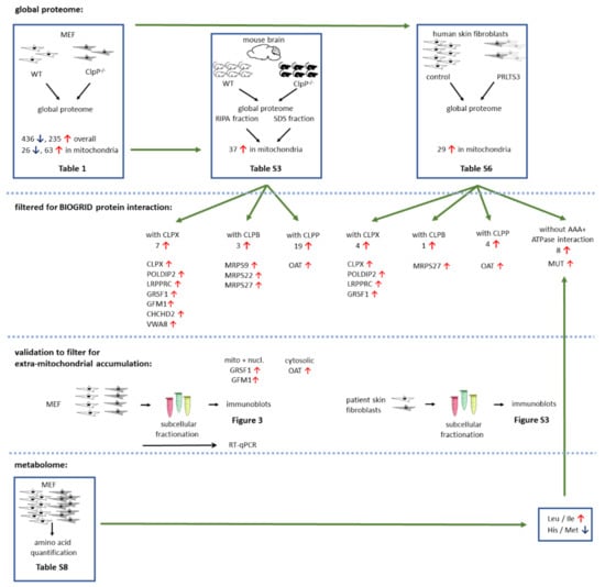 Here, the identification of initial events of pathogenesis was achieved by a multi-layered approach: The consistency of ClpP-dependent protein accumulations was assessed in global proteome profiles from mouse embryonal fibroblasts (MEFs), mouse brain fractions, and skin fibroblasts from patients with biallelic ClpP variants. This approach was conducted under the assumption that the comparison of fibroblasts (where energy is mainly generated by glycolysis and the downstream mitochondrial Krebs cycle) versus brain tissue (where energy is mainly generated via mitochondrial respiration) would help to define the invariant key ClpXP substrates. We classified accumulated mitochondrial proteins according to evidence if (i) they are bona fide interactors of the disaggregase ClpX, (ii) targets of the disaggregase ClpB, (iii) protein interactors of ClpP itself, or (iv) rather may represent indirect effects due to delayed protein complex turnover and inefficient assembly that are consequences of altered chaperone abundance. The degree to which such misassembly of matrix enzymes impacts mitochondrial function was studied by mouse fibroblast metabolome mass spectrometry and from a literature review (scheme in Figure 1). Immunoblots of putative ClpP substrates in subcellular fractions assessed if excess amounts of ClpX and its interactors associate with docking sites outside mitochondria. The findings provide prominent novel insights into how ClpP inactivity has an early preferential ClpX-dependent impact on tRNA processing factors of mitochondria (and possibly the nucleus). As variants in other tRNA processing factors such as PRORP, HARS2, and LARS2 are a known cause of PRLTS, a common mechanism of disease pathogenesis begins to emerge for Perrault syndrome. In addition, consistent accumulations that are potentially independent of ClpX were observed for specific vitamin-associated multimerized factors in the mitochondrial matrix.