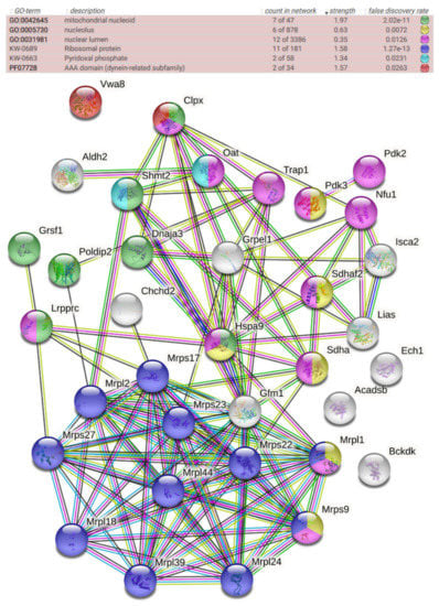 Thus, we tested if these accumulations also occur in different cell fractions of female 15-month-old ClpP-null mouse brains. At this mouse stage, the cell stress of old age already becomes apparent, while senescent multimorbidity has not yet begun. Sequential extractions from the brain tissue were performed, first obtaining readily solubilized proteins with RIPA buffer, and subsequently solubilizing the resulting pellets in 2% SDS buffer to also study the more insoluble proteins. After label-free mass spectrometric quantification of individual peptides, the two resulting global proteome profiles from the brain extract supernatant and pellet (Table S3) were compared with the initial data from complete MEFs (Table S1). The significantly upregulated factors were filtered for consistency among all lists, and for mitochondrial localization, producing a list of 37 potential ClpP degradation substrates (Table S3). In the resulting STRING diagram (Figure 2) and pathway enrichment statistics (Table S4), prominent accumulations of mitoribosomal proteins (blue color) and chaperones were observed as before, and mitochondrial nucleoid factors became more prominent (green), with most of these diagram nodes connected to ClpX accumulation. Interestingly, several of the consistently upregulated factors localized not only to mitochondria but, in parallel, also to the nucleus, particularly the nucleolus (Figure 2).