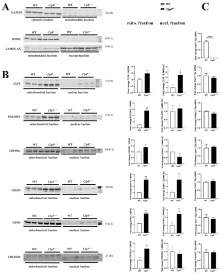 Analyses of redistribution of mitochondrial factors to the nucleus. (A) Quantitative immunoblots were used to control subcellular fractionation quality and loading by GAPDH, HSP60, or LAMIN A/C protein abundance. (B) Immunoblot validation of protein accumulation in mitochondrial and nuclear fractions (membrane at left margin, bar graph in center). (C) Assessment of underlying transcript levels by RT-qPCR (right margin) for specific ClpX interactors in ClpP−/− (n = 3) versus WT (n = 3) mouse embryonal fibroblasts. * p < 0.05, ** p < 0.01; **** p < 0.0001; T represents 0.05 < p < 0.10.