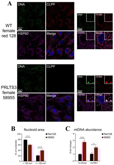 Human fibroblasts were grown on 12 mm coverslips 16 h before experiments. The next day, cells were washed with PBS, fixed with 4% paraformaldehyde for 20 min, permeabilized with 0.1% Triton X-100 in PBS for 5 min, and blocked with PBS containing 10% FBS for 30 min. After blocking, cells were incubated with primary antibodies for 60 min and stained with secondary antibodies for 60 min. Cells were washed with PBS between each step. Coverslips were mounted with Prolong Gold anti-fade reagent containing DAPI (Molecular Probes, Eugene, OR, USA). Images were collected with a Nikon Eclipse Ti2 inverted microscope using a 60X oil-immersion objective and NIS-Elements Advanced Research software, version 5.21.02 (Amsterdam, The Netherlands). Z-stack images were processed using the NIS Extended Depth of Focus module to create focused, single-plane maximum intensity projection TIFs. Nucleoid area quantification was performed largely as described [17]. Briefly, approximately 3–4 unique fields of view from 3 distinct images (of each genotyping at each treatment) comprising between 800 and 1000 nucleoids were captured at random. Scale information was added to Image J (Bethesda, MD, USA), then images were made binary, and the area of each nucleoid was determined using the ‘Analyze Particles’ feature of ImageJ. Nucleoids were divided into 2 size cut-offs: <150 nm2 and ≥150 nm2, and values were plotted as percentage (%). The following antibodies were employed: anti-TFAM (Proteintech (Manchester, UK), 23996-1-AP; 1:200), anti-HSP60 (Santa Cruz, (Dallas, TX, USA), sc-1052; 1:300), anti-ClpP (Proteintech (Manchester, UK), 60004-1-LG; 1:200), anti-DNA (Millipore (Darmstadt, Germany), CBL-186 AC-30-10; 1:300).