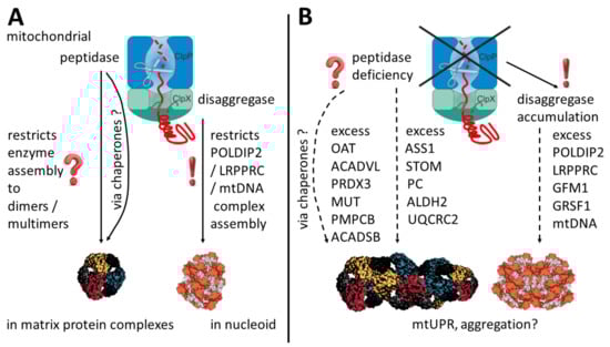 Some of these findings seem clearly mediated by ClpX accumulation and can occur without ClpP alteration, in view of a previous report [50] where recombinant ClpX was overexpressed 1.77-fold in mouse C2C12 myoblasts and proteome profiling then detected accumulations of LRPPRC (1.66-fold), POLDIP2 (1.45-fold), GFM1 (1.62-fold), GRSF1 (1.38-fold), FASTKD2 (1.58-fold), and MTPAP (1.41-fold). Thus, the accumulation of factors with a known function at the mitochondrial nucleoid/RNA granule appears to be directly dependent on ClpX excess.