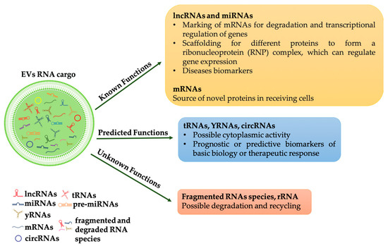 RNAs species into EVs and their functions. RNAs in extracellular vesicles can be classified into three types: (1) RNAs that have known function when internalized into target cells, such as mRNAs, miRNAs and lncRNAs; (2) RNAs that are predicted to be functional (for example, tRNAs, YRNAs, circRNAs); (3) RNAs with unknown functions (for example, fragments RNAs and rRNAs), some of which may be functional, but others may be non-functional degradation products.