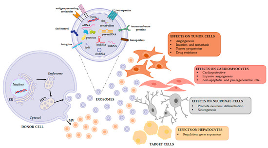Many studies demonstrated the functional role of the RNA-cargo that, selectively packaged inside EVs, are transferred to target cells. Firstly, the transfer of exosomal mRNAs and miRNAs was reported by Valadi et al. in 2007, which revealed a “novel mechanism of genetic exchange between cells” [26]. Since that study, numerous papers have demonstrated that the horizontal transfer of exosomes cargo can modulate target cells behaviors.