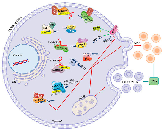 Regarding non-coding RNAs loading, the sumoylation of heterogeneous nuclear ribonucleoproteins (HNRNPs) is one of the proposed mechanisms. HNRNPA1, after sumoylation, recognizes the long non-coding RNA ELNAT1 thus mediating its packaging into EVs [55]. While HNRNPA2B1, after sumoylation, binds miRNAs recognizing the EXOmotif GGAG (conserved motifs that allow the specific miRNAs sorting into exosomes) and this interaction is responsible for miRNAs loading into exosomes [56].