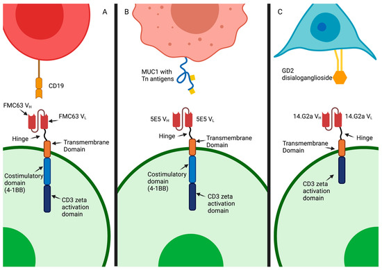 Schematic representation of exemplary CAR T-cell interactions with antigenic targets made of amino acids, such as FMC63-based anti-CD19 CAR T-cells targeting CD19+ B-cells (A), 5E5-based anti-Tn-MUC1 CAR T-cells targeting the glycoepitope Tn-MUC1 on a solid tumor cell (B), and 14G2a-based anti-GD2 CAR T-cells targeting the ganglioside GD2 on a neuroblastoma cell (C).