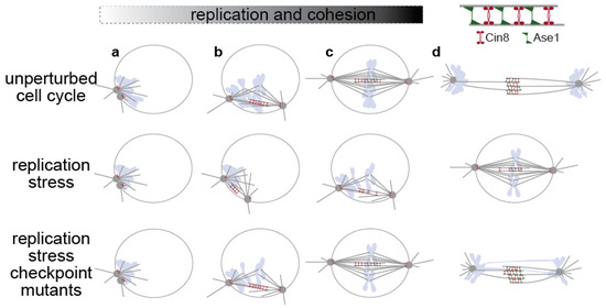 In yeast cells (only the nucleus and the spindle are depicted here), spindle formation occurs after bulk DNA replication has been completed (unperturbed cell cycle, a–c), but can occur in parallel to DNA replication upon replication stress (replication stress, a–c). The S-phase checkpoint prevents anaphase spindle elongation by inhibiting spindle-associated factors, like kinesin-5 Cin8 and Ase1/PRC1 (replication stress a–c), and by stabilizing cohesion once cohesion has been established (c,d). These mechanisms do not operate in checkpoint mutants under replication stress, and cells elongate their spindle before completion of bulk genome duplication, performing catastrophic mitosis (d). Nuclear membrane, SPBs and MTs in grey, chromosomes in light blue, nuclear membrane not shown at anaphase.