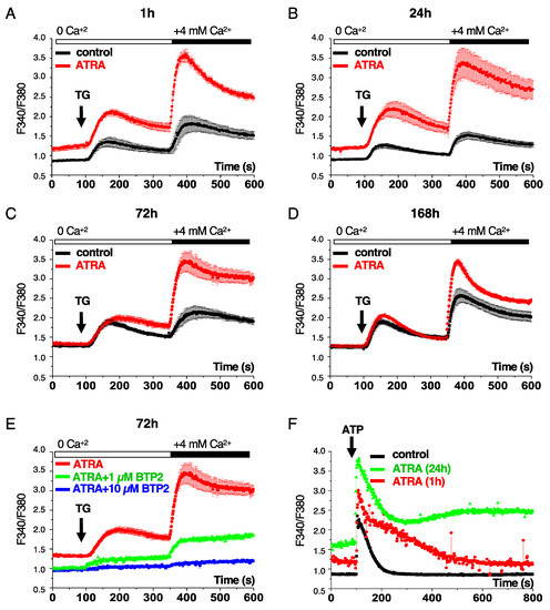 From the Ca2+ imaging experiments (Figure 1A–D), we also noticed an increase of the basal intracellular Ca2+ concentration ([Ca2+]i) in NB4 cells treated with ATRA. This effect was observed as early as one hour after treatment (Figure 1A) and remained increased after 24 h as compared to untreated cells (Figure 1B). For longer cell culture time points (72 h to 168 h), the level of basal ([Ca2+]i) was increased to a comparable extent in untreated and ATRA-treated cells (Figure 1C,D).