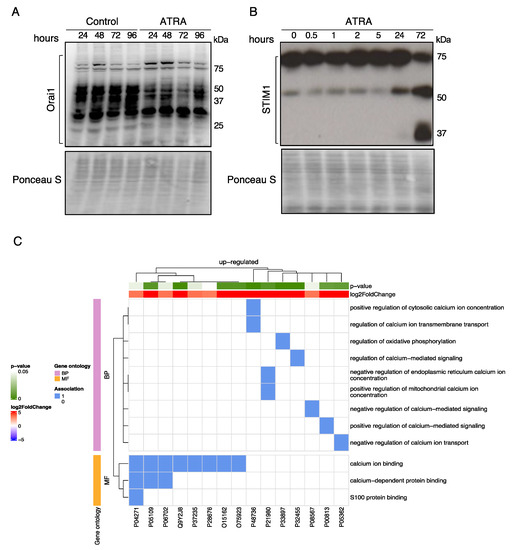 ATRA modulates calcium-regulatory proteins. (A,B) NB4 cells were treated with 1 μM ATRA for the indicated time. Immunoblot analyses of ORAI1 and STIM1 protein expression levels are shown. For each membrane, Ponceau S Red staining was used as protein loading control. Bands corresponding to different forms of ORAI1 and STIM1 are depicted. (C) NB4 cells were treated with 1 μM ATRA for 3 days and then subjected to proteomic analysis. The heat map visualizes the annotation of statistically significant proteins (p-value < 0.05) identified by proteomics data analysis (columns) by GO terms associated with Ca2+ signaling (lines; see also Supplementary Data File 3). The blue color represents an existing annotation while the white color represents none.