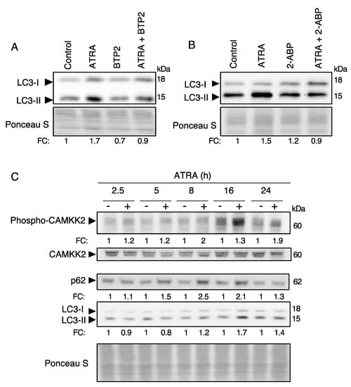 To elucidate the Ca2+ cascade involved in autophagy regulation, we next examined the activity of CAMKK2, which is the primary Ca2+ sensor that relays the Ca2+ signal to autophagy [32,33,34]. As shown in Figure 3C, ATRA treatment of NB4 cells resulted in a significant and time-dependent activation of CAMKK2, as indicated by the detection of the active phosphorylated form of CAMMK2. This response is associated with an increase in the levels of LC3-II and p62/Sequestosome 1 (SQSMT1).