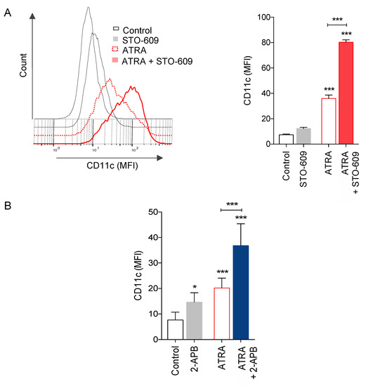 We also examined the possible role of SOC channels on NB4 cell maturation induced by ATRA. Upon inhibition of SOC channels by 2-APB, we observed a significant increase in ATRA-induced NB4 cell maturation as indicated by the induction of CD11c expression after 72 h of treatment (Figure 5B).