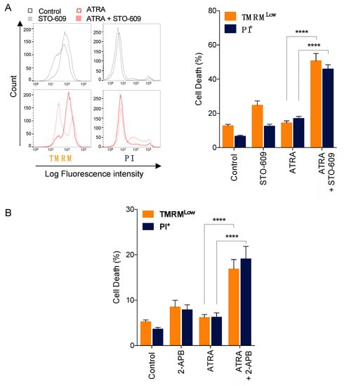 Pharmacological inhibition of SOC channels and CAMKK2 promotes ATRA-induced cell death. NB4 cells were pre-treated with STO609 (5 μg/mL) and then treated with 1 μM ATRA for 5 days. Cell death was assessed by the measurement of (i) the mitochondrial transmembrane potential using TMRM dye and (ii) the plasma membrane permeability using propidium iodide (PI) staining. (A) Left panel, representative flow cytometry histograms for TMRM and PI cell staining. Right panel, percentage of cells exhibiting low TMRM staining and high PI staining were scored for each condition. (B) NB4 cells were pre-treated with 2-APB (44 μM) prior to treatment with 1 μM ATRA for 2 days. At the end of this treatment, cell death was scored as described in (A,B) Results are means ± SD of three and four independent experiments realized in triplicate for STO-609 and 2-APB, respectively. **** p-value < 0.0001.
